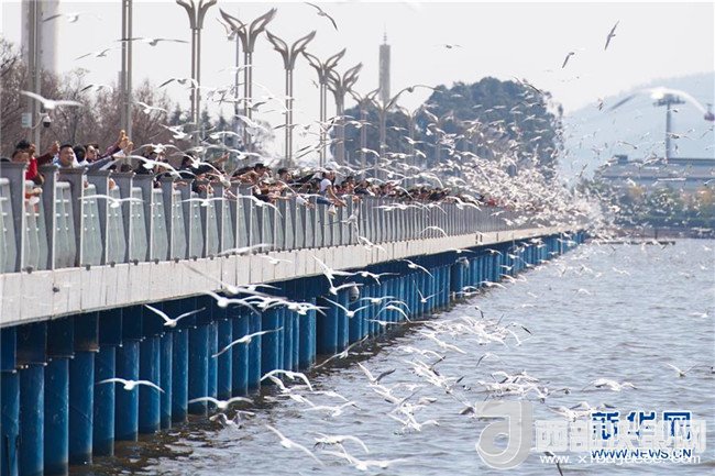 2月21日,游人在昆明市滇池海埂觀景大道上觀賞、投喂紅嘴鷗。
