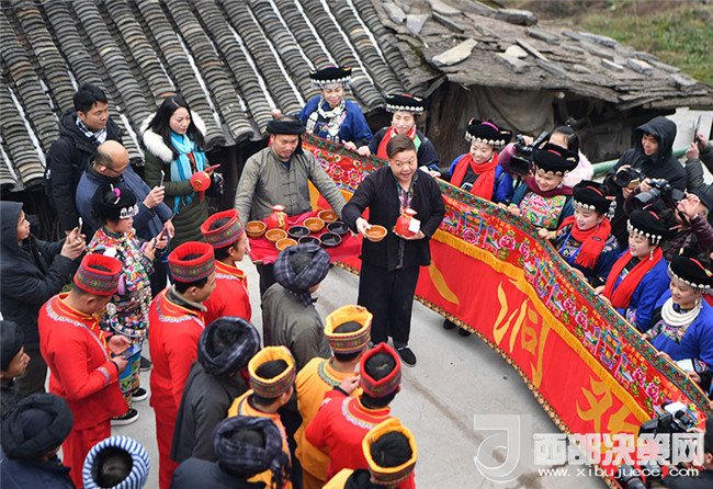 2018年2月4日,在湖南省湘西土家族苗族自治州花垣縣十八洞村,新郎的迎親隊(duì)伍遇上新娘親友攔門(mén)。當(dāng)日,兩對(duì)分別來(lái)自湘西和湘潭的新人特地來(lái)到十八洞村體驗(yàn)苗族婚禮。新華社發(fā)(薛宇舸 攝)
