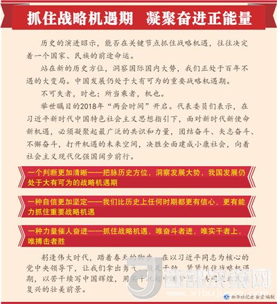 舉世矚目的2018年“兩會(huì)時(shí)間”開啟。代表委員們表示,在習(xí)近平新時(shí)代中國特色社會(huì)主義思想指引下,面對(duì)新時(shí)代新使命新機(jī)遇,必須凝聚起最廣泛的共識(shí)和力量,團(tuán)結(jié)奮斗、矢志奮斗、不懈奮斗,打開機(jī)遇的未來空間,決勝全面建成小康社會(huì),向著社會(huì)主義現(xiàn)代化強(qiáng)國闊步前行。