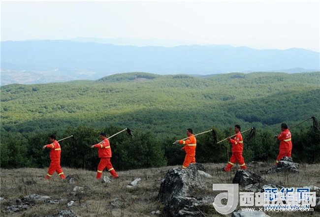 沙子坡林場的護(hù)林員在夕陽下巡山歸來(2013年7月7日攝)。