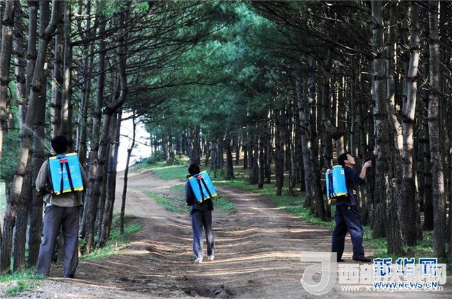 沙子坡林場的護(hù)林員在林區(qū)內(nèi)噴灑藥劑防治病蟲害(2013年7月8日攝)。