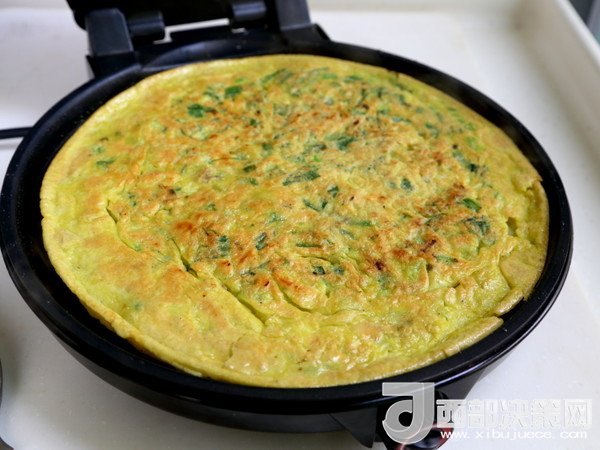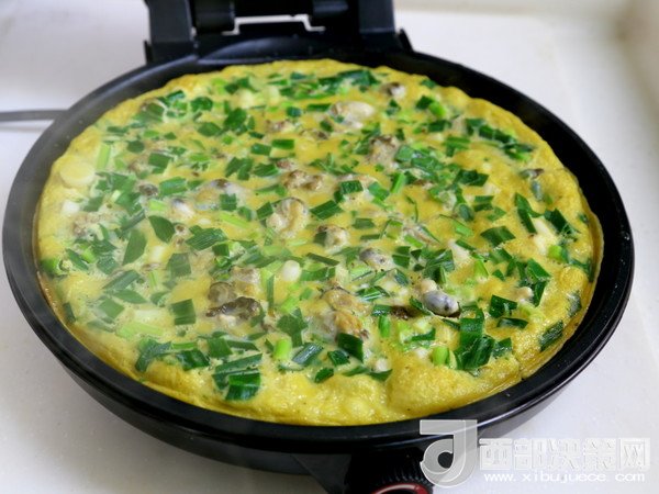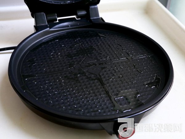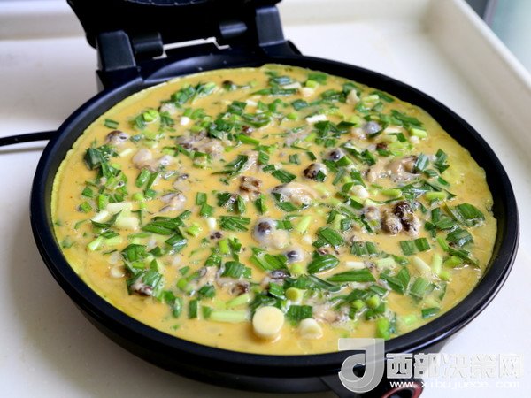 6.將拌好的海蠣糊平攤在電餅鐺中,蓋上蓋,大火煎。