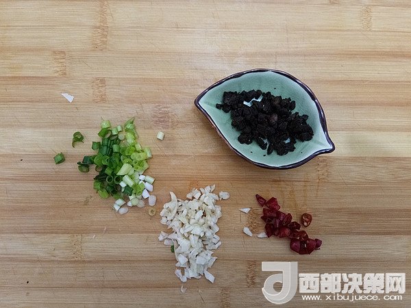 輔料:豆豉 1茶匙 大蒜 3瓣 生抽 1茶匙 小蔥 2棵 姜絲 5克 干辣椒 2個