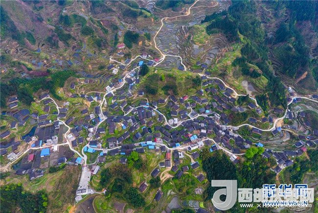 這是借助無人機(jī)拍攝的融水苗族自治縣桿洞鄉(xiāng)黨鳩村公路(4月17日攝)。
