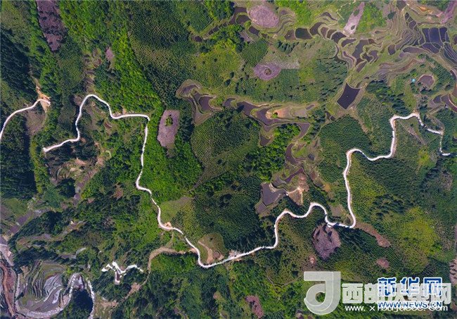 這是借助無人機(jī)拍攝的融水苗族自治縣桿洞鄉(xiāng)花孖村公路(4月17日攝)。