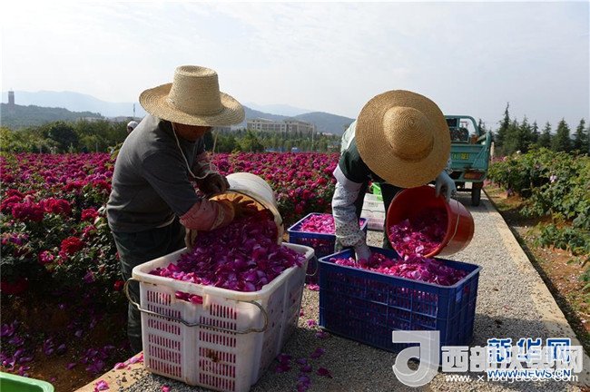 4月25日,兩名工作人員在云南大學(xué)呈貢校區(qū)的玫瑰園收集已采摘的玫瑰準備送往學(xué)校食堂。