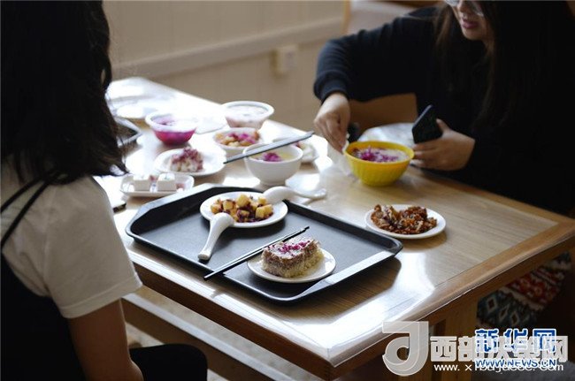 4月25日,兩名云南大學(xué)的研究生來到食堂體驗“玫瑰宴”。新華社發(fā)