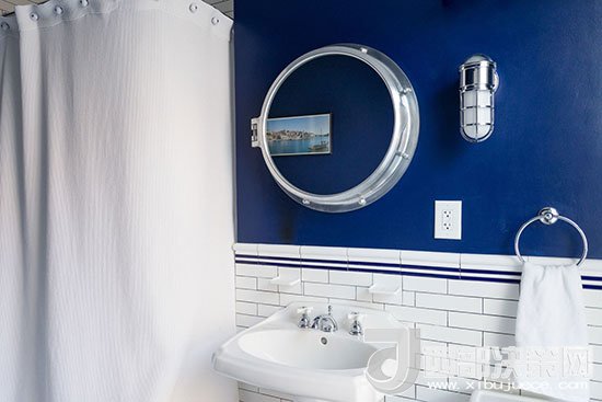 衛(wèi)浴間選擇深藍(lán)色與白色搭配,墻面中間位置用藍(lán)色條紋腰線(xiàn)來(lái)裝飾,頗有海軍風(fēng)的味道,干凈清爽。