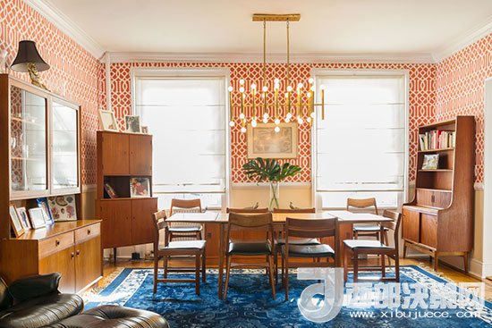 餐廳墻面用橙色為底、帶白色幾何紋理的壁紙來(lái)鋪貼,暖色系空間更能刺激人的食欲,鋪設(shè)藍(lán)色地毯既在空間中形成了色彩碰撞,又是與客廳色調(diào)的呼應(yīng)。