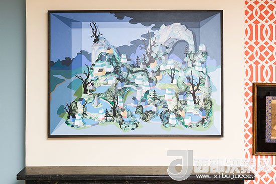 壁爐上方的墻面用掛畫(huà)來(lái)裝飾,藍(lán)色系的色彩與家居整體風(fēng)格相融合,富有創(chuàng)意感的畫(huà)面讓家更有藝術(shù)氣息。