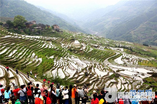 4月30日,游客在廣西龍勝龍脊古壯寨觀(guān)賞梯田美景。新華社發(fā)(王滋創(chuàng)攝)
