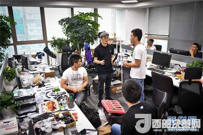 在深圳科技園的大疆創(chuàng)新總部,民用無(wú)人機(jī)領(lǐng)軍者汪滔(中)參與研發(fā)人員的討論(2015年5月22日攝)。新華社記者毛思倩攝