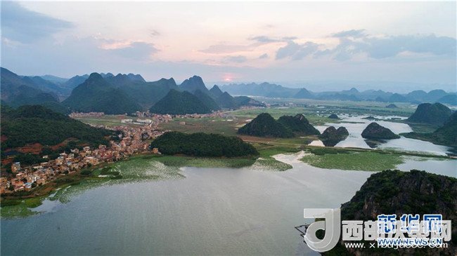 這是5月26日無人機(jī)拍攝的普者黑國(guó)家濕地公園日落一景。