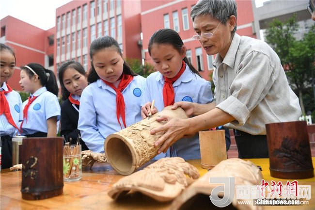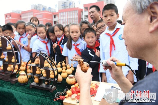 5月28日,為弘揚中華民族優(yōu)秀傳統(tǒng)文化,迎接“文化與自然遺產日”的到來,重慶舉行“多彩非遺、美好生活”為主題的非遺進校園系列活動。圖為學生參觀葫蘆烙畫。 陳超 攝
