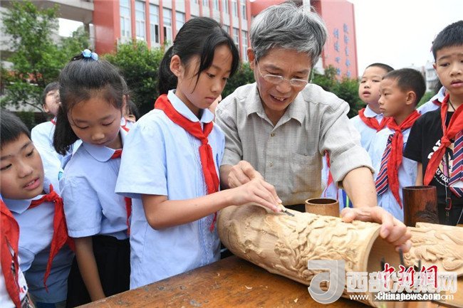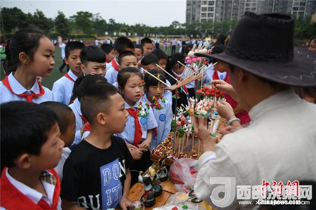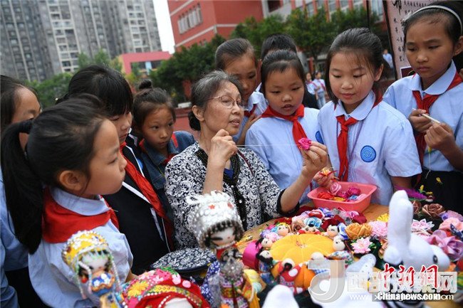 活動現(xiàn)場,15個國家級和市級非物質文化遺產項目為重慶沙坪壩西永第一小學校的師生帶來一場豐盛文化遺產大餐,讓師生們近距離感受了中華優(yōu)秀傳統(tǒng)文化的魅力。圖為活動現(xiàn)場學生們參觀非物質文化遺產項目。 陳超 攝