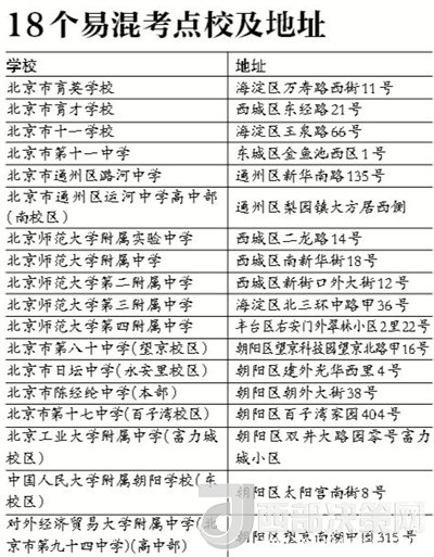 此外,還有一些學(xué)校的初、高中部,比如對外經(jīng)濟(jì)貿(mào)易大學(xué)附屬中學(xué)(北京市第九十四中學(xué))考點(diǎn)就設(shè)在高中部,考生千萬不要到初中部參加考試。