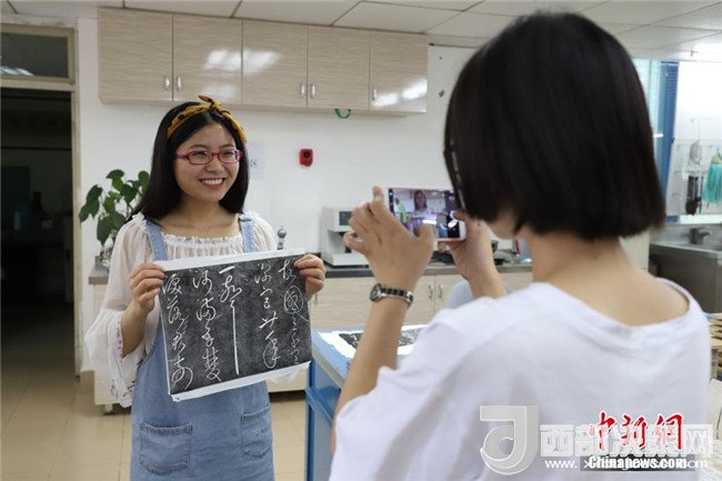 6月9日,一位女同學與自己的拓片作品合影。當日,貴州省古籍保護中心在貴州省圖書館舉辦“古籍修復技藝體驗”活動?;顒娱_展了古籍修復、碑文傳拓等技藝體驗。眾多高校師生和民眾紛紛前往體驗。中新社發(fā)瞿宏倫攝