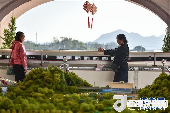 在泰國東北部呵叻府巴沖縣,參觀者在中泰鐵路合作項目一期工程開工儀式上與展出的中國復興號高鐵列車模型合影(2017年12月21日攝)。新華社記者 李芒茫 攝