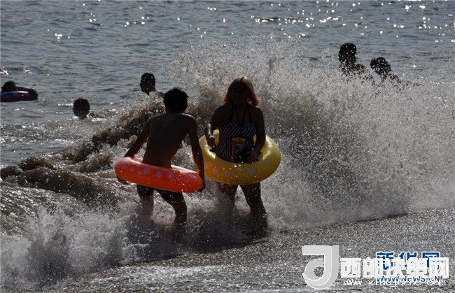 7月1日,游客在青島第一海水浴場(chǎng)戲水。 新華社記者 李紫恒 攝