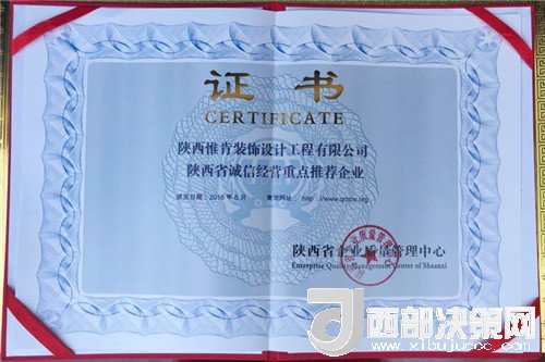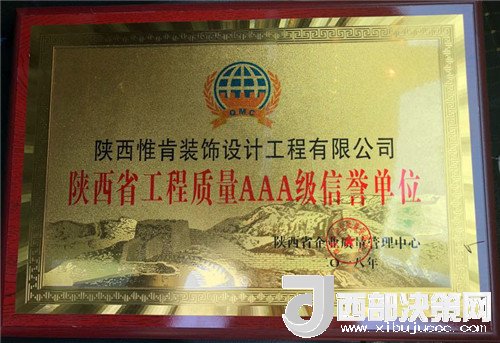 西部決策網(wǎng)——西部大開發(fā)訊(帥華鋒 張曉紅)近日,寶雞市惟肯裝飾榮獲陜西省企業(yè)質(zhì)量管理中心頒發(fā)《陜西省工程質(zhì)量AAA級(jí)信譽(yù)單位》和《陜西省誠(chéng)信經(jīng)營(yíng)重點(diǎn)推薦單位》兩項(xiàng)榮譽(yù)稱號(hào)。