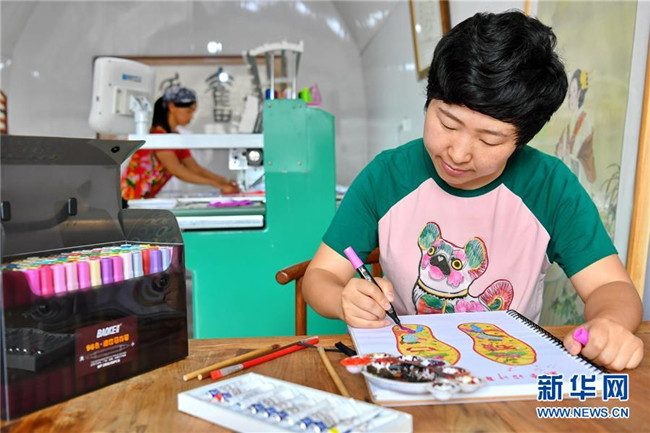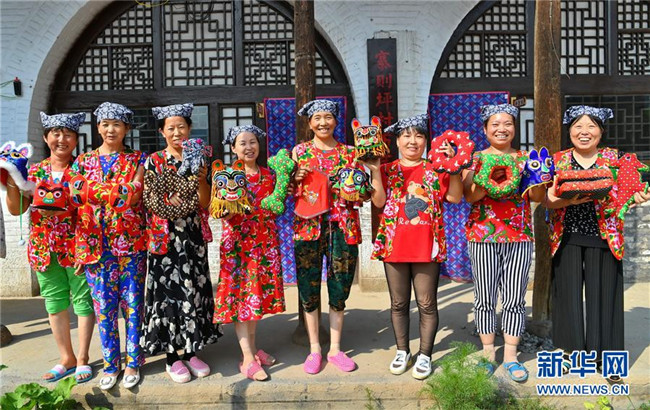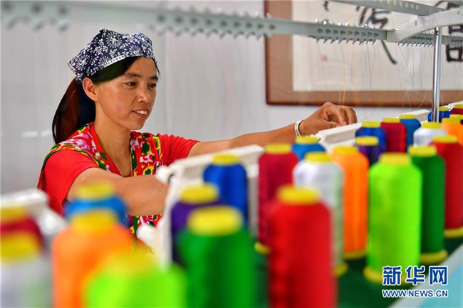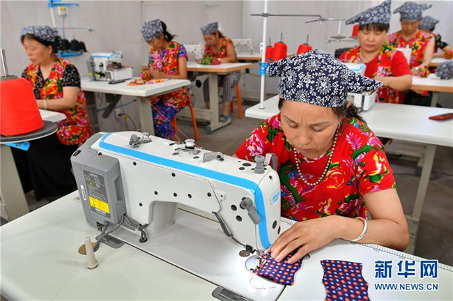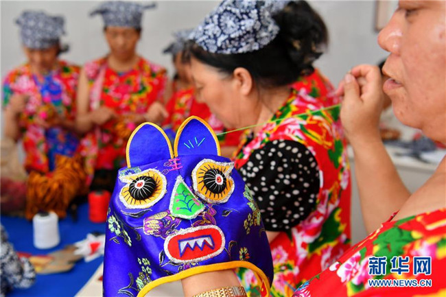山西省臨縣寨則坪村是呂梁山上典型的貧困村。2017年5月,該村邀請縣里的老手藝人對10余位婦女進行布藝加工的集中培訓,并在村委院子里建起了布藝加工廠。靠著加工富有當?shù)靥厣男瑝|、肚兜、布老虎等工藝品,這些婦女每月能拿到1500元的工資,這幫助她們順利摘下了“窮帽子”。新華社記者 曹陽 攝
