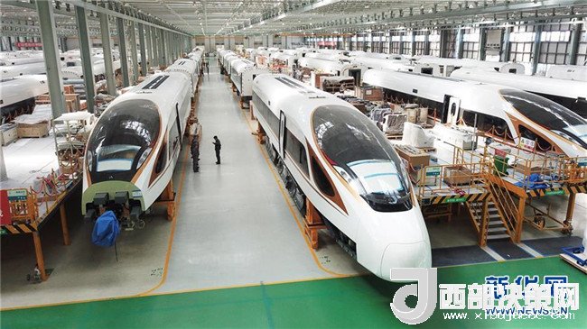 在位于吉林長春的中車長客股份公司高速動車組裝配車間里,幾列“復(fù)興號”中國標(biāo)準(zhǔn)動車組在進(jìn)行裝配(2017年9月14日攝)。新華社記者張楠攝