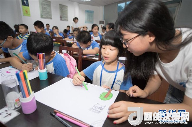 7月26日,在柯橋區(qū)安昌街道社區(qū)文化禮堂,大學生志愿者陪同“小候鳥”上美術課。