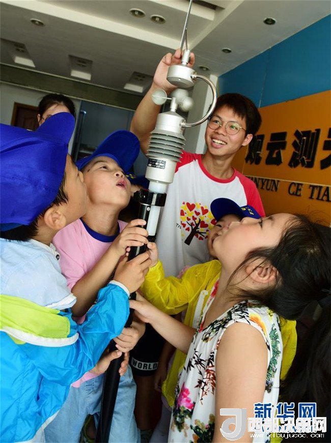 8月2日,江蘇鎮(zhèn)江市寶塔路街道潤(rùn)州花園社區(qū)的小朋友在丹徒國(guó)家基本氣象站觀察體驗(yàn)便攜自動(dòng)氣象站的功能。 新華社發(fā)(石玉成 攝)