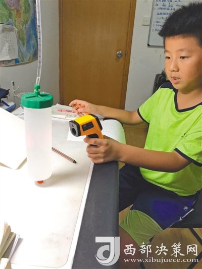 首先設(shè)計一個裝置,下部寬大的容器盛水,上部細(xì)長的管子可以觀察水的體積變化。然后將裝滿水的容器放入冰箱冷凍層,形成冰水混合物,此時水溫接近零攝氏度。最后將容器取出,用手持式測溫儀測量水溫……這一系列步驟,不是實(shí)驗(yàn)室里進(jìn)行的專業(yè)研究,而是南京師范大學(xué)附屬小學(xué)四年級學(xué)生徐子越和王美澄正在做的暑假作業(yè),他們通過觀察水的體積隨溫度的變化,來解釋冰為什么會浮在水面上。