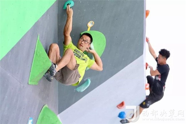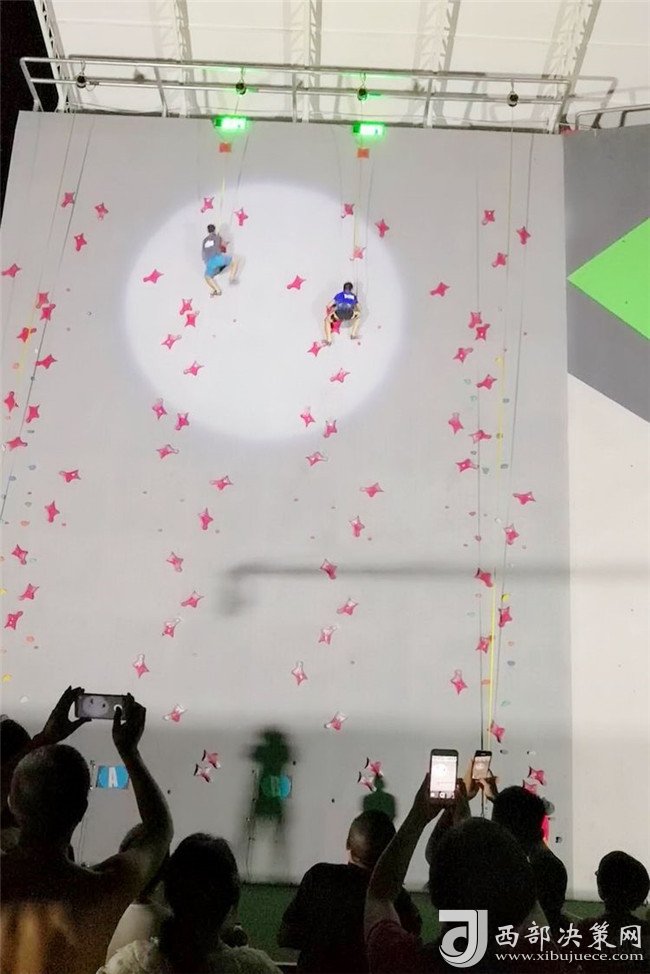 專(zhuān)業(yè)攀巖選手與資深攀巖愛(ài)好者在難度賽道進(jìn)行表演賽