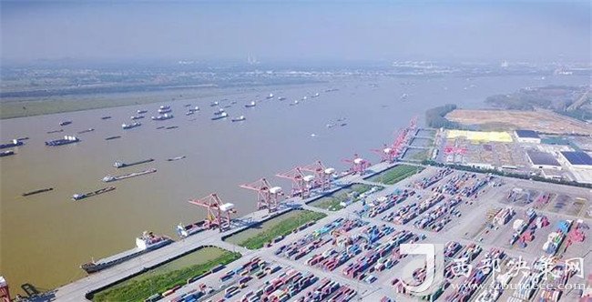 航拍長江上貨船往來,碼頭上集裝箱擺放有序(來源:新華網(wǎng))