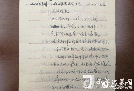 這本工作筆記內頁紙上的字跡娟秀工整,細密地記錄著對人民公社的一些看法:“人民公社是政社不分、一大二公、五位一體的體制;出工一條龍,收工一窩蜂;不僅用行政手段干預經(jīng)濟工作,就連喂10只以上的鴨子都要割‘尾巴’……”。