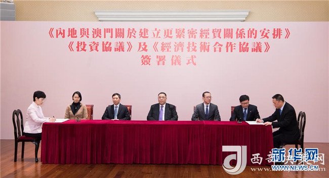 2017年12月18日拍攝的商務部與澳門特區(qū)政府《內(nèi)地與澳門關(guān)于建立更緊密經(jīng)貿(mào)關(guān)系的安排》(CEPA)下的《投資協(xié)議》和《經(jīng)濟技術(shù)合作協(xié)議》簽約儀式現(xiàn)場。新華社記者張金加攝