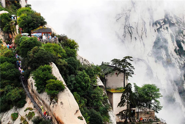 魏晉南北朝時(shí),還沒有通向華山峰頂?shù)牡缆?。直到唐朝,隨著道教興盛,道徒開始居山建觀逐漸在北坡沿溪谷而上開鑿了一條險(xiǎn)道,形成了"自古華山一條路"。