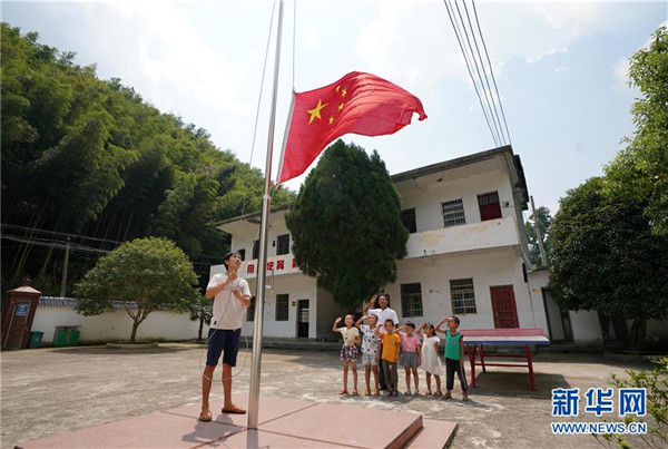 9月4日,在蘆嶺教學點,陳云根(后)和黃文春(前)帶著全校6名學生升國旗?,F(xiàn)在學校操場已經(jīng)鋪上了水泥。新華社記者 宋振平 攝
