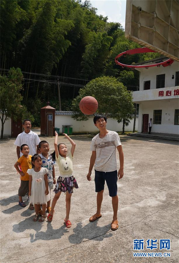 9月4日,在蘆嶺教學點,陳云根(左一)和黃文春(右一)帶著孩子們上體育課。 新華社記者 宋振平 攝