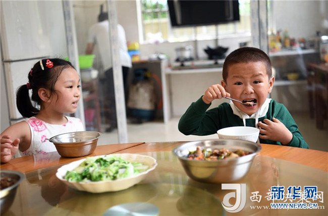 學(xué)生在吃高自仁做的午飯(9月3日攝)。新華社記者 萬象攝