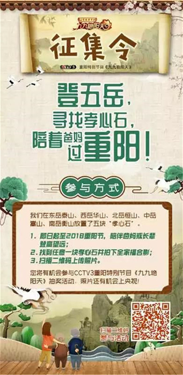 今天是2018年10月17日,農(nóng)歷九月初九重陽(yáng)節(jié)。由中央廣播電視總臺(tái)央視綜藝頻道(CCTV-3)攜手中華五岳名山,共同舉辦的“登五岳 尋找孝心石 陪著爸媽過(guò)重陽(yáng)”暨“福滿華夏 孝行五岳”最美笑容和祝福征集活動(dòng)正在火熱進(jìn)行當(dāng)中,活動(dòng)至10月17日重陽(yáng)節(jié)。只要您陪著爸爸媽媽在五岳任意一塊“孝心石”旁拍下全家福合影,并通過(guò)掃碼填寫報(bào)名表格,上傳圖片,就可以參加CCTV-3重陽(yáng)特別節(jié)目《九九艷陽(yáng)天》的抽獎(jiǎng)活動(dòng),照片還有機(jī)會(huì)上央視哦!