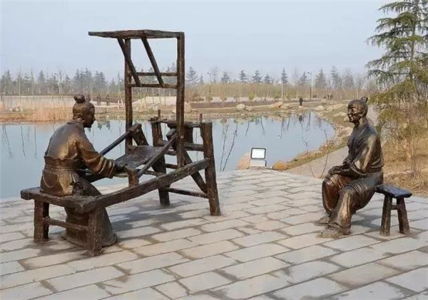 董永,相傳為東漢時(shí)期千乘人,年少喪母,因避兵亂遷居安陸。其后父親亡故,董永賣身至一富家為奴,換取喪葬費(fèi)用。上工路上,于槐蔭下遇一女子,自言無(wú)家可歸,二人結(jié)為夫婦。女子以一月時(shí)間織成三百匹錦緞,為董永抵債贖身,返家途中,行至槐蔭,女子告訴董永:自己是天帝之女,奉命幫助董永還債。言畢凌空而去。因此,槐蔭改名為孝感。
