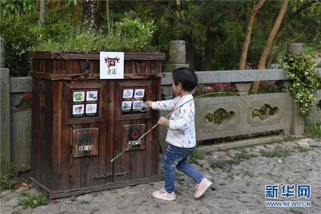 在浙江省衢州江山市石門鎮(zhèn)清漾村,小朋友將垃圾分類放入垃圾箱內(nèi)(4月20日攝)。新華社記者 黃宗治 攝
