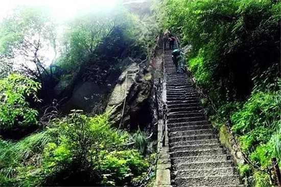 一是直上云頭。如千尺幢、上天梯、否梯、百尺峽等,開鑿于石隙崖壁,直上直下,有聳入云天之勢(shì);二是凌空載道。一邊臨壁,一邊凌空,奇絕險(xiǎn)要。如南峰長(zhǎng)空棧道、北峰至蒼龍嶺棧道;