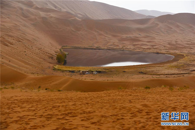 陰雨中的沙漠湖泊,常常讓人以為是一面鏡子(10月18日攝)。 巴丹吉林沙漠位于內蒙古西部阿拉善盟,是中國第三大沙漠,沙丘起伏的曲線陡變成高聳的沙山,碧藍的湖泊散落在沙海間。 新華社記者 李仁虎 攝
