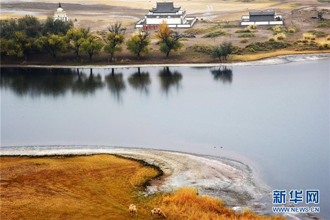 巴丹吉林廟位于名為“廟海子”的湖泊旁(10月19日攝)。 巴丹吉林沙漠位于內蒙古西部阿拉善盟,是中國第三大沙漠,沙丘起伏的曲線陡變成高聳的沙山,碧藍的湖泊散落在沙海間。 新華社記者 李仁虎 攝