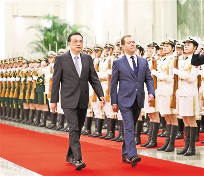 李克強指出,今年以來,中俄經(jīng)貿合作持續(xù)快速發(fā)展,年內貿易額有望突破1000億美元,未來合作潛力巨大。希望雙方繼續(xù)提升貿易便利化水平,擴大相互投資規(guī)模,深化農業(yè)合作,推進中俄跨境電子商務健康穩(wěn)定發(fā)展,加強在創(chuàng)新領域、特別是在科技應用和基礎研究領域合作。以今明兩年舉辦中俄地方合作交流年為契機,調動兩國各地方開展更加廣泛的合作。繼續(xù)深化人文交流,加強媒體、青年、旅游、衛(wèi)生、體育各領域交流。