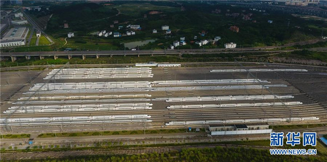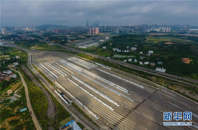 這是廣西南寧動(dòng)車所內(nèi)準(zhǔn)備發(fā)往各地的動(dòng)車組列車(7月1日無人機(jī)拍攝)。