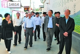 全國(guó)黨建研究會(huì)會(huì)長(zhǎng)李景田(前排左四)、副會(huì)長(zhǎng)杜德?。ㄇ芭抛蠖┑纫恍性谏轿魇x城市調(diào)研基層黨建。焦建宇攝/光明圖片