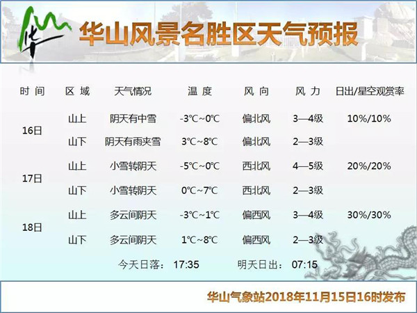 據(jù)天氣預(yù)報顯示,華山今、明兩日會有降雪天氣: