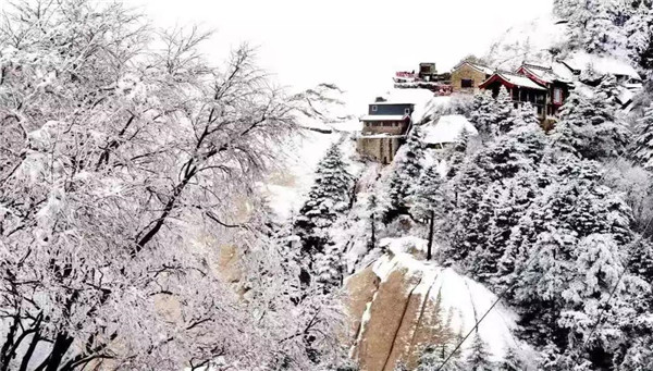 冬天的雪景——千峰筍石千株玉,萬樹松蘿萬朵銀。華山的雪景不僅是銀白的世界,而是猶如千姿百態(tài)的雪雕。雪霽,便有“林海玉樹”、“雪堆玉石”、“云中雪龍”、“巖崖雪屋”、“梨花飛揚”、“天女散花”、“紅帶玉墜”等各具形態(tài)的奇特景觀。置身在雪的境界,神清氣爽,洗心革面,冰清玉潔,忘卻凡塵。