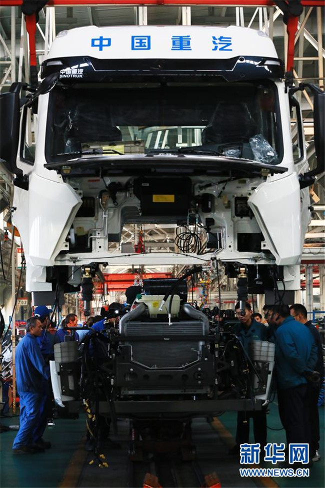 工人在中國重汽集團(tuán)濟(jì)寧商用車總裝生產(chǎn)線上裝配汽車(11月22日攝)。 新華社發(fā)(李明放 攝)