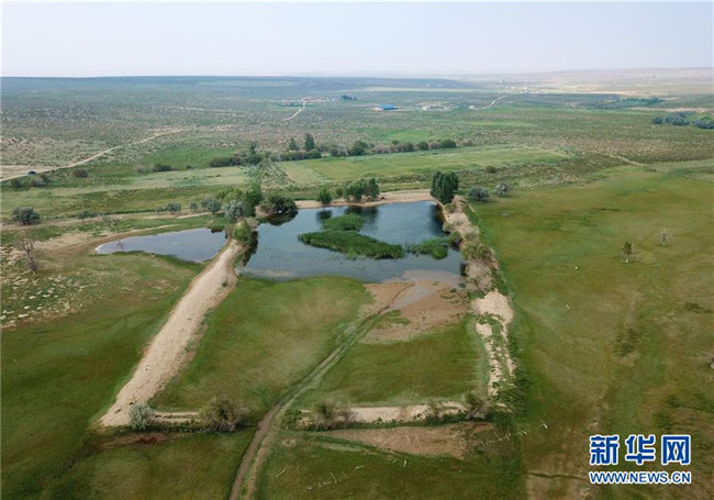 內(nèi)蒙古杭錦旗沙日召嘎查牧民白音道爾計(jì)治理過的庫布其沙漠(7月31日無人機(jī)拍攝)。新華社記者邢廣利攝